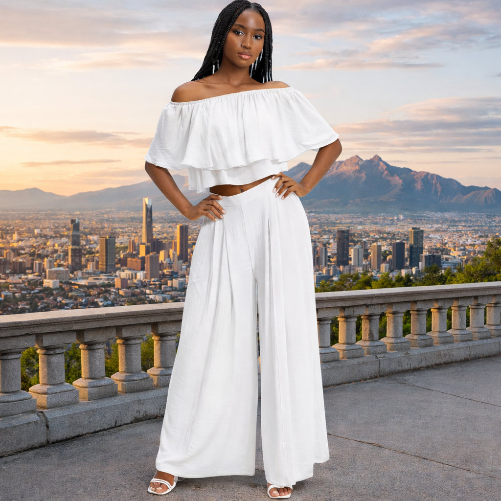 This elegant two-piece set features an off-the-shoulder top with an elastic neckline and flowing sleeves. The high waist pants are designed with pleats and an elastic back waistband for comfort. Pair this ensemble with heels and statement earrings for a chic evening look.