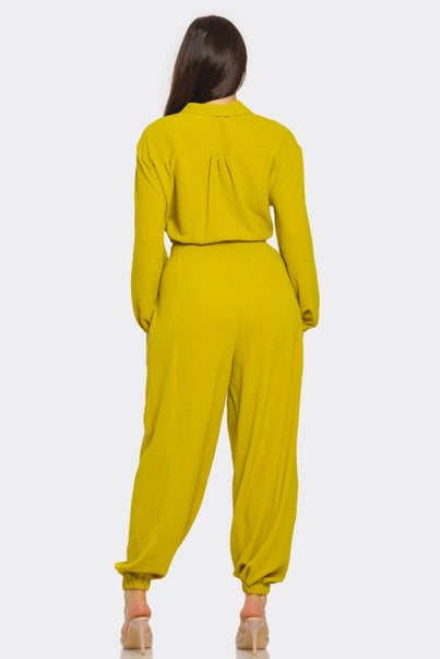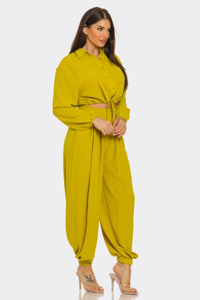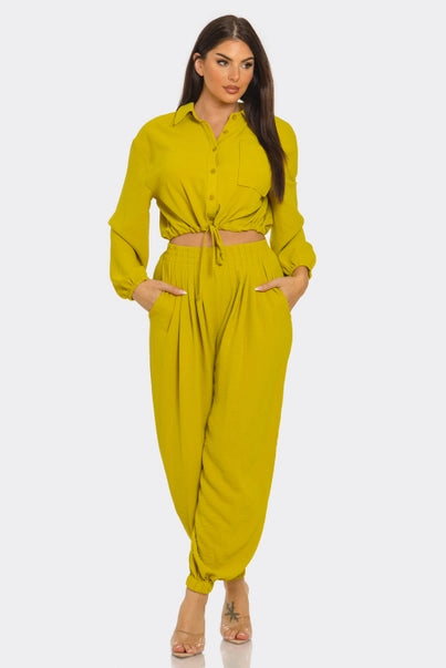 Button Down Side One Pocket Detail Collar Neck Elastic Waist Trim Spaghetti Tie Long Sleeve Crop Top And Elastic Waistband Side Pockets Pants Set