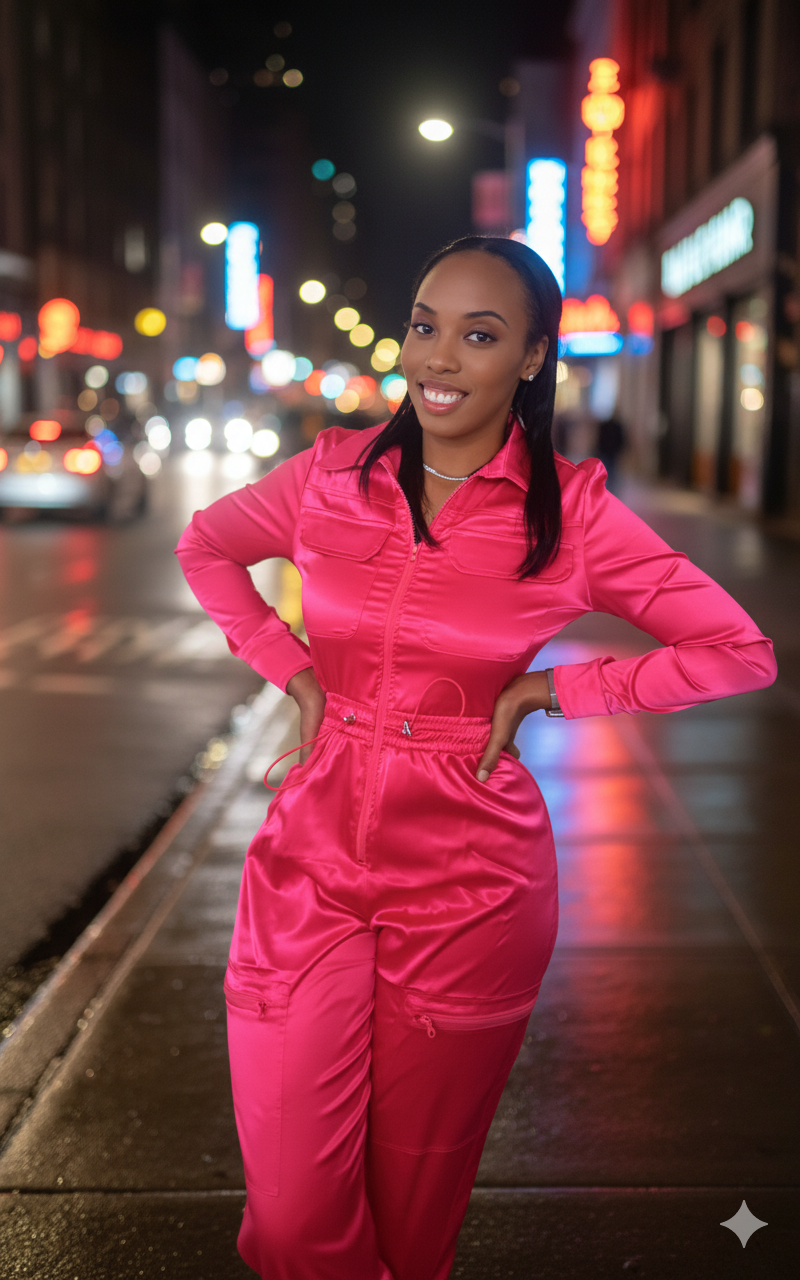 Satin Solid Front Zipper Side Pockets Detail Collared Long Sleeve Top And Elastic Waistband Tie Side Zipper Pockets Detail Jogger Cargo Pants Jumpsuit
